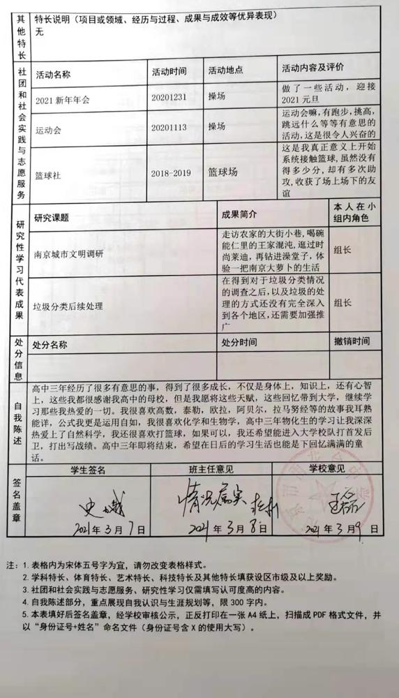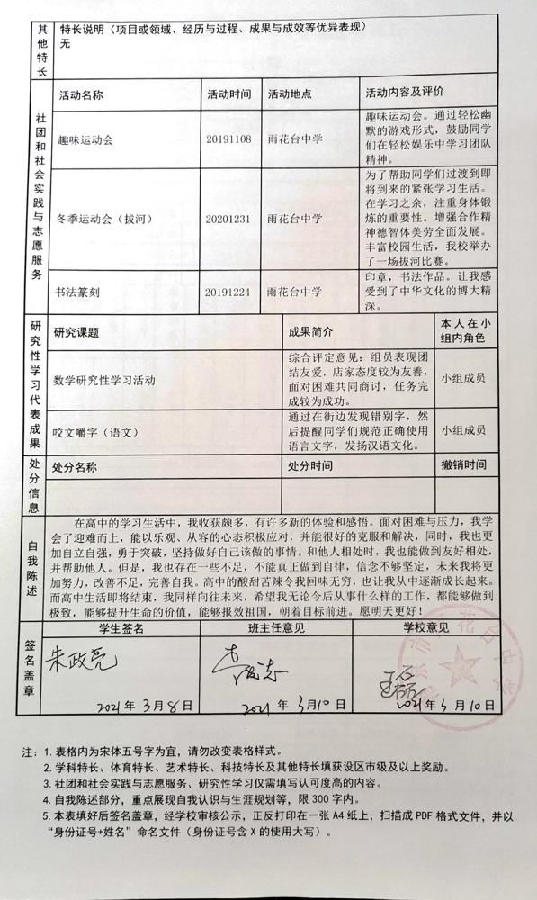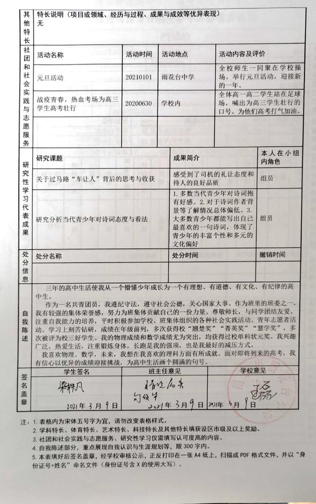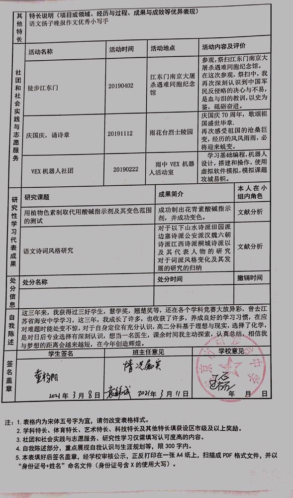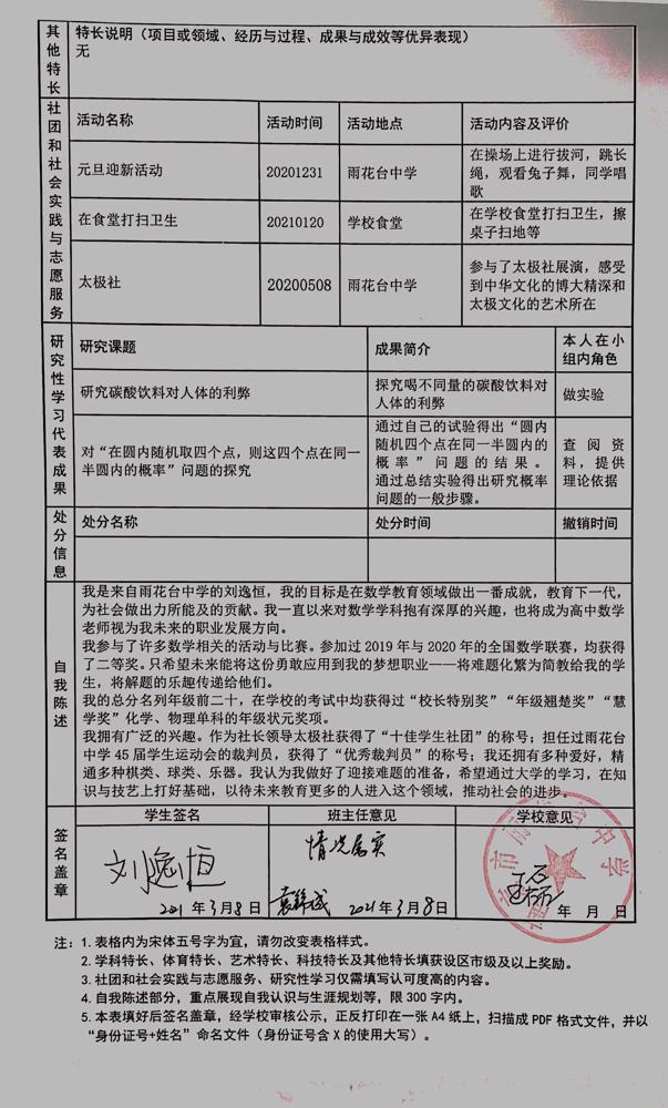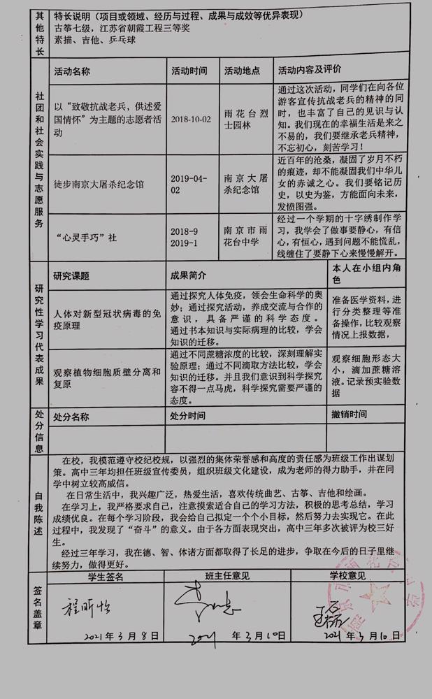 2021年雨花台中学拟报考高校“强基计划”的“综合素质评价”内容已经经过审核,现公示如下。公示时间2021年5月19日-25日,如有异议,请向课程教学处张公法主任反映。具体考生名单及“综合素质评价表”公示如下: