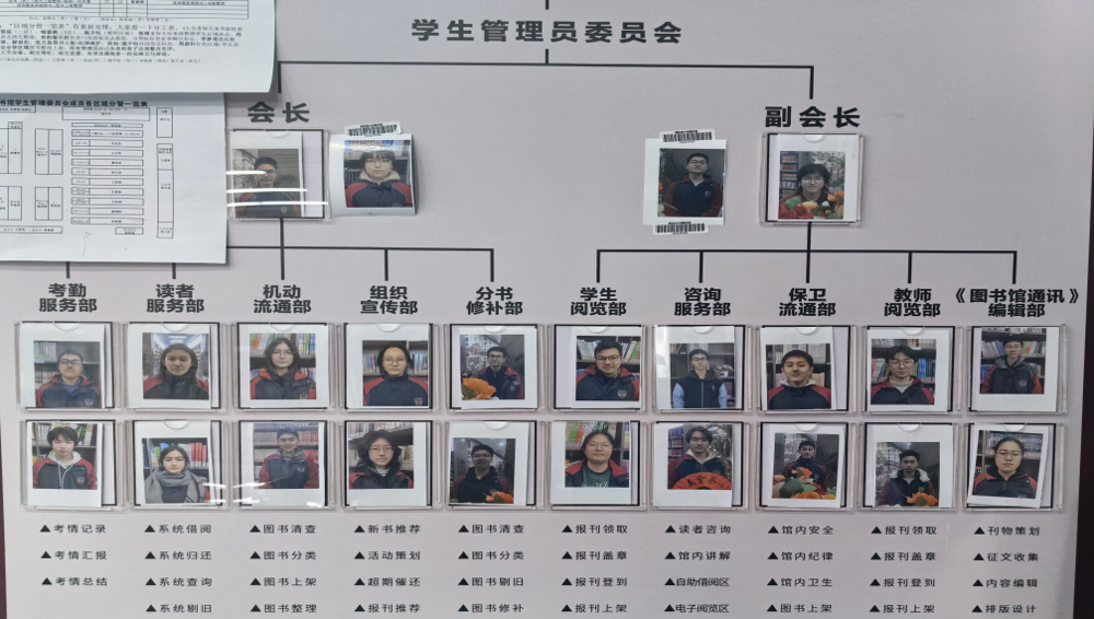 | 7 | 4 | 曹诗语 | 组织宣传部部长+图书上架整理 | 19 | 9 | 王宇泽 | 分书修补部部长+图书上架整理 |