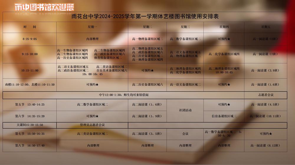 【读者服务】雨花台中学图书馆2024-2025学年第一学期预约使用安排表