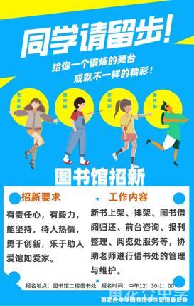 招新人数:30人, 招新对象:高一新生 招新截止时间: 2021.9.18-2021.10.18中午12:30-1:00 招新地点:图书馆二楼借书处 招新要求:有责任心,有毅力,能坚持,待人热情,勇于创新,乐于助人爱馆如爱家。 工作内容:新书上架、排架、图书借阅归还、前台咨询、报刊整理、阅览处服务等,协助老师进行借书处的管理与维护。