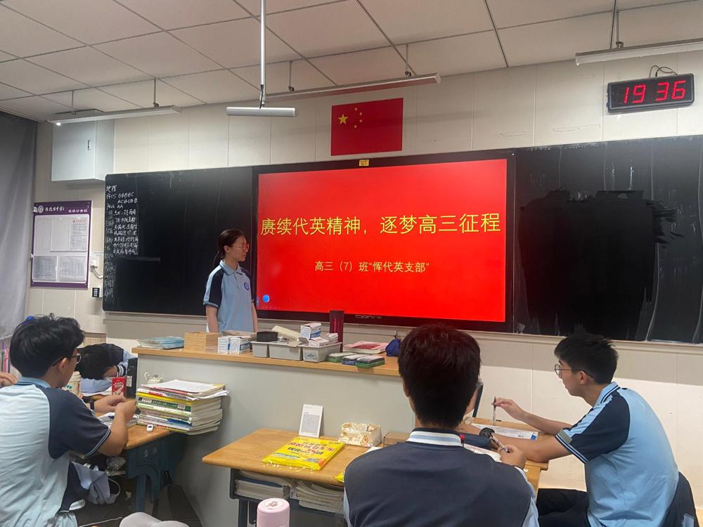 为纪念恽代英同志诞辰 130 周年,进一步传承革命先辈精神,已获评校 “恽代英支部” 的高三(7)班团支部,于 7 月 10 日在班级内开展了 “赓续精神血脉,逐梦高三征程” 主题教育活动,全体团员参与了活动,在回望先辈足迹中凝聚了高三备考的奋斗力量。