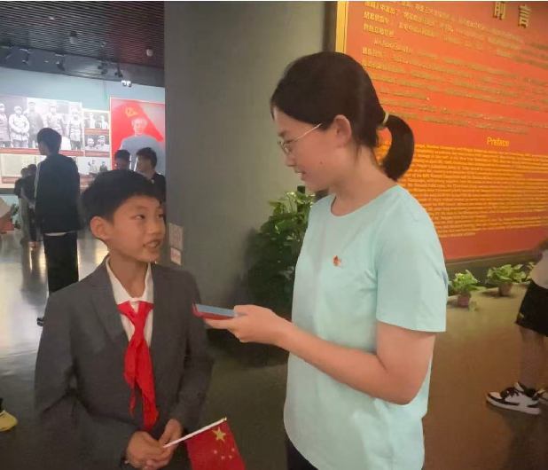 参观过程中,同学们主动与在场的小观众交流互动,热情讲述了革命故事、普及了历史知识。大家还将精心准备的富含中国元素的精美挂件赠送给了孩子们,在传递了爱国情怀的同时弘扬了中华优秀传统文化,现场气氛温馨融洽。